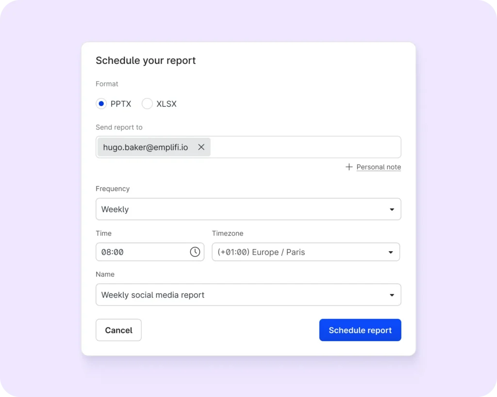 Schedule recurring, branded performance exports that land in client inboxes automatically, proving your impact without manual work.