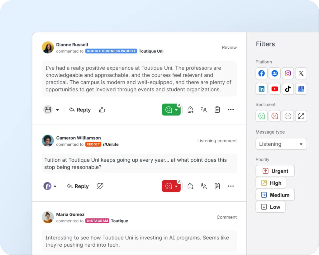 Emplifi provides real-time social listening and automated alerts to help universities monitor discussions related to campus safety, policy changes, and institutional reputation. Teams can respond quickly from a unified inbox before issues escalate.