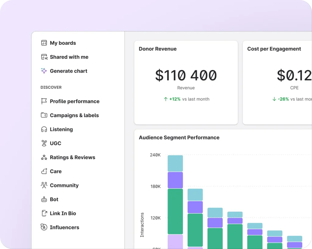 Emplifi integrates social engagement data with CRM systems to help institutions understand how content influences applications, event registrations, and giving campaigns. This allows teams to connect social media management to measurable enrollment and advancement outcomes.