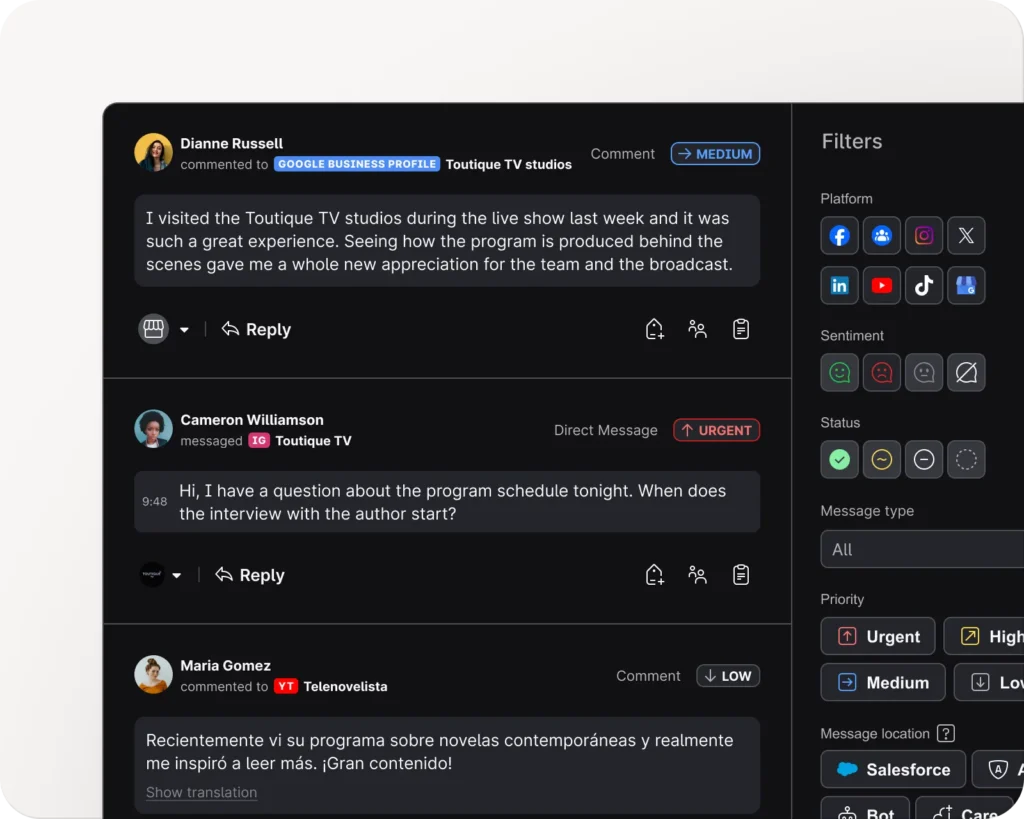 Yes. Emplifi helps teams manage high-volume engagement across platforms during live shows, premieres, and breaking news. A unified inbox and real-time monitoring tools make it easier to moderate, respond, and keep audiences engaged.