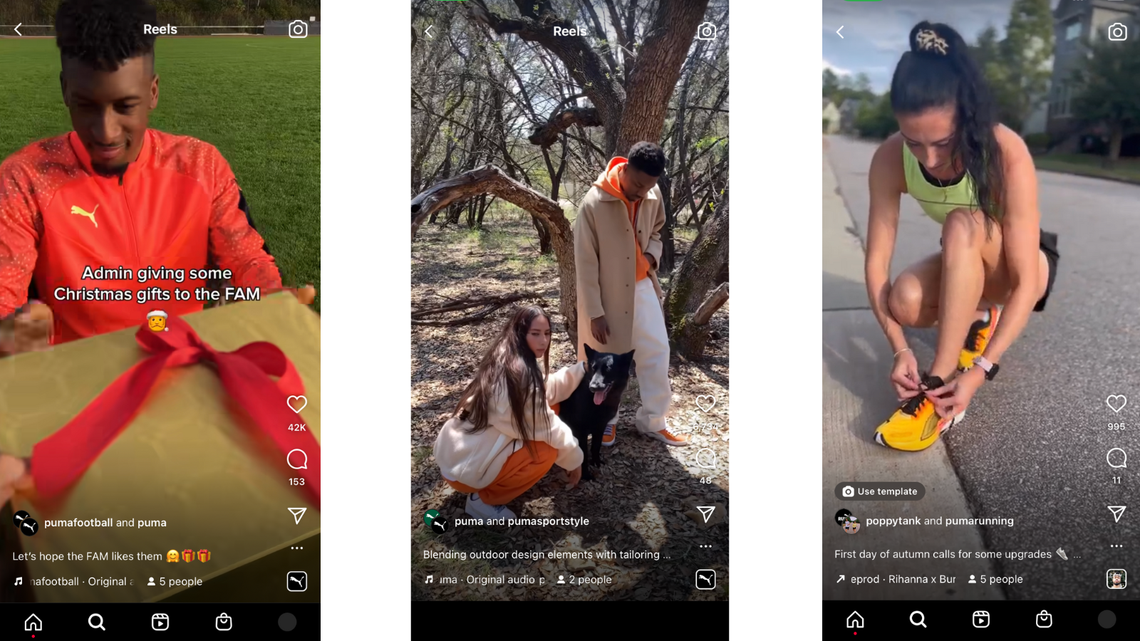 Having multiple accounts enables the brand to drill down into specific topics its followers care about. For example, the Puma’s running profile has Reels like “3 tips to survive trail running” and sneak peeks of new running shoe designs. Puma’s marketing team makes sure to co-post Reels with influencers and across the brand’s portfolio of niche accounts. This ensures maximum viewership and is mutually beneficial for all accounts.