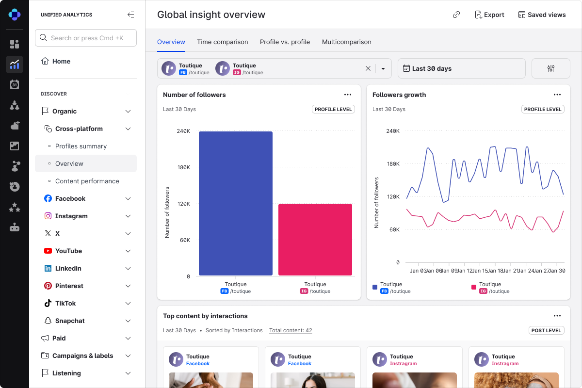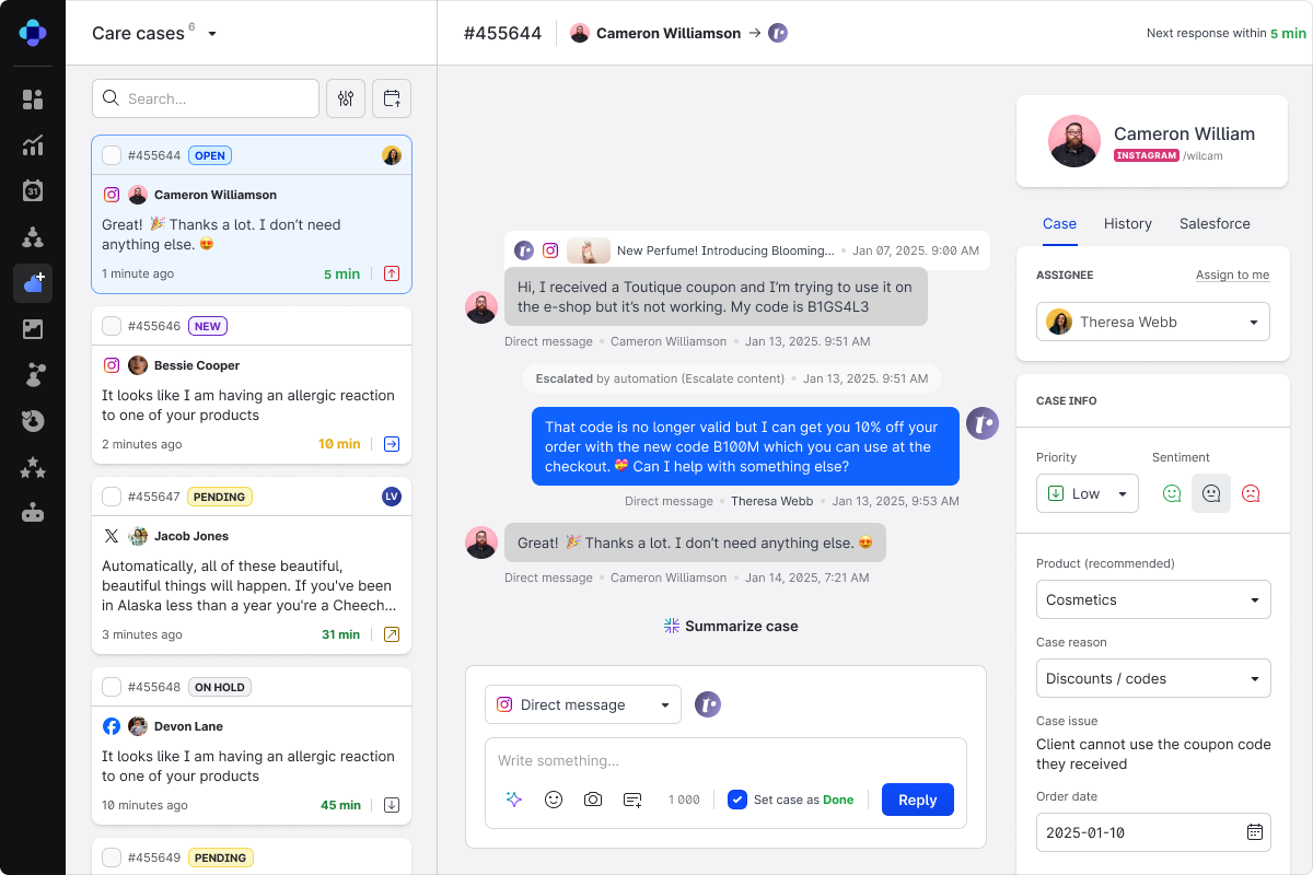A unified Marketing, Commerce, and Care platform brings social marketing, paid media, customer content, reviews, social commerce, and customer support into one system with a shared data layer, so teams can act on real-time insights without switching between tools.