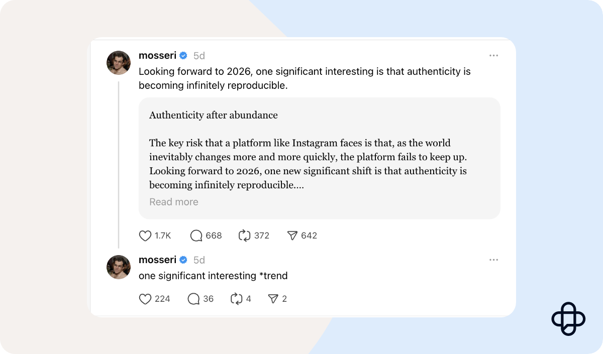 Why it matters: This highlights how social platforms are preparing for an era where distinguishing real from synthetic media becomes increasingly difficult and could change how content is surfaced and trusted.